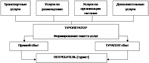 Туроператор комплектует пакет программ, пакет тура (пэкидж-тур), который может быть заказным или инклюзив-туром (с жестким, заранее определенным, не изменяющимся при продаже набором услуг). Соответственно первый продается с вариантами обслуживания, второй – без вариантов, с комплексным набором услуг. Это зависит от возможностей приема и от маршрута путешествия. Функции туроператора на рынке практически совпадают с деятельностью предприятий оптовой торговли. Он закупает в значительных объемах услуги предприятий туристской индустрии (гостиниц, ресторанов и т. д.), комплектует из них собственные программы туров и осуществляет их реализацию через посредников (турагентов) или напрямую потребителям (рис.1.3).
