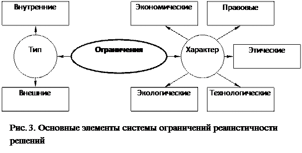 Одно из важнейших требований к решениям – их реалистичность. Особенно это касается глобальных решений. Для обеспечения реалистичности решений необходимо наличие определенных условий, предпосылок. Основные элементы системы ограничений по реалистичности решений представлены на рис. 3.