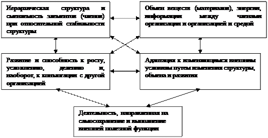 Рисунок 1 - Структурное представление понятия «организация» [12, стр. 10] Организация, рассмотренная в приведенной интерпретации, носит всеобъемлющий характер. Присущие ей проявления находят свое реальное воплощение и в творениях человеческих рук, и в творениях природы. Примерами рукотворных организаций могут служить простые и сложные механизмы, используемые человеком в качестве орудий труда, социальные организации различного типа в виде предприятий, учебных заведений, политических, религиозных, научных, культурных учреждений, реализующие многообразные задачи общественного бытия. Со своей стороны и мир природы демонстрирует огромное количество форм и типов организованности, стирая – с организационной точки зрения – грань между живой и неживой ее составляющими. Есть много общего в ведении социального хозяйства у человека и высших насекомых, особенно при разделении общественных и трудовых обязанностей. Много организационных аналогий можно заметить в конструкциях сложных жилищ, создаваемых муравьями, термитами, пчелами, которые отражают общеприродный организационный опыт. Целесообразный порядок, устойчивость наблюдаются и в строении клетки, и в структуре атома, и в сменяемости времен года, и в поведении планет и звездных галактик, что подтверждает целесообразное обустройство всего мироздания, в котором полная неорганизованность по сути не имеет смысла. Именно организационное творчество природы и сознательная организационная деятельность человека, подвергнутые глубокому, всестороннему исследованию и преломлению через призму организационного опыта, и составляют суть теории организации, определяют ее место и роль в системе человеческих знаний. Любая организация требует постоянных организационных усилий по ее сохранению, поддержанию и развитию. Процессы организации не прекращаются с появлением объекта организации. Поэтому разделение на процесс и результат часто условно. Всякая организация, имеющая цель и способная к актам выбора и решения на пути к этой цели, представляет собой сложную динамическую систему со всеми присущими ей свойствами (рис. 2). В этом отношении многие организации сходны с живыми организмами. Для них характерны зарождение, рост и развитие. Им необходим постоянный обмен веществом, энергией и информацией с окружающей средой. Они имеют систему управления, основанную на обратных связях, которая обеспечивает внутренние взаимодействия и целесообразное поведение. Потребность (инстинкт) самосохранения заставляет их избегать опасных обстоятельств или защищаться от повреждающих влияний. Тем самым они ведут борьбу за существование. Они постоянно адаптируются к изменению внешних условий. Они склонны к образованию родственных сообществ. Они болеют, стареют и умирают…