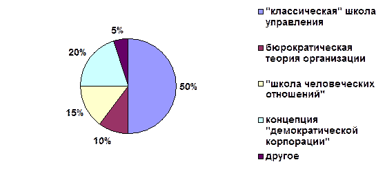 Рисунок 12 – Диаграмма, отражающая мнения респондентов по поводу теоретической разработки, наиболее присущей организации, в которой они осуществляют свою деятельность По поводу вопроса о наиболее приемлемой теоретической разработке были выявлены следующие точки зрения: по мнению 35% респондентов (7 чел.) наиболее приемлема «классическая» школа управления (вариант ответа А); 30% (6 чел.) посчитали таковой «школу человеческих отношений» (вариант ответа В); 25% (5 чел.) – концепцию «демократической корпорации» (вариант ответа Г), 5% (1 чел.) – бюрократическую теорию организации; 5% (1 чел.) отметили вариант ответа Д) другое. Наглядным образом точки зрения респондентов представлены на рис. 13.