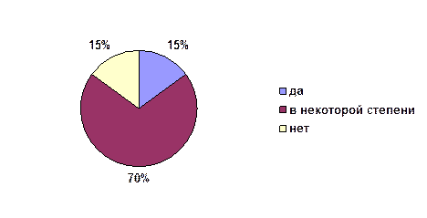Рисунок 15 – Диаграмма, отражающая мнения респондентов по поводу вопроса о том, насколько для их организации характерно расширение кооперирования среди сотрудников, поставщиков и потребителей По поводу вопроса о соответствии деятельности организации, в которой работают участники опроса, современным теоретическим разработкам, мнения распределились следующим образом: 15% респондентов (3 чел.) ответили утвердительно (вариант ответа А); 60% (14 чел.) отметили вариант ответа Б) в некоторой степени; 15% (3 чел.) посчитали, что функционирование их организации не соответствует современным теоритическим разработкам. Наглядным образом точки зрения респондентов представлены на рис. 16.