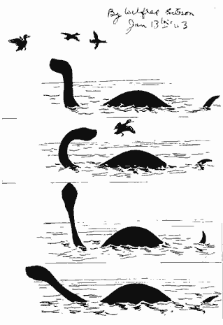 Зарисовка туши с обозначением ее частей.На фотографиях, найденных Леблоном, имеется приписка, в которой говорится, что они были отосланы на Тихоокеанскую биологическую станцию в Нанаймо, на остров Виктория. Однако в лаборатории нет никаких записей об их получении. В 1987 году морской капитан, капитан Хагелунд, сообщил о том, что некогда поймал детеныша кадборозавра. Во время семейного путешествия по морю он как‑то раз бросил на ночь якорь, когда вместе с другими членами семьи увидел, как на поверхности воды двигается нечто диковинное. При внимательном рассмотрении выяснилось, что это было небольшое «похожее на угря морское существо, двигавшееся с полностью высунутой из воды головой, причем на поверхности показывались отдельные части спинного хребта из‑за волнообразных движений его длинного и тонкого туловища». Это небольшое существо было поймано в сеть и поднято на борт яхты. Оно оказалось примерно шестнадцати дюймов в длину, с дюйм толщиной, а на нижней челюсти у него имелись маленькие острые зубы. На спине у него виднелись чешуйки вроде пластинок, тогда как снизу его туловище покрывала мягкая шерстка. Два небольших ласта на плечах и два ластообразных плавника на хвосте дополняли его облик. Это, судя по всему, был молодой экземпляр существа, найденного внутри кашалота в 1937 году. Капитан Хагелунд, понимая, что это была очень необычная находка, вознамерился доставить существо в научную лабораторию в Нанаймо и потому поместил его в пластмассовое ведро, наполненное морской водой. До самой ночи это маленькое существо билось и скреблось, пытаясь выбраться наружу. Слушая эти все более отчаянные звуки, Хагелунд проникся состраданием, а потому вернулся на палубу и опрокинул ведро в море. Он увидел, как маленькое существо быстро поплыло прочь. Другого такого существа пока не было поймано. Загадочные водные существа Имея столь внушительные свидетельства, заслуживающие доверия рассказы очевидцев и вдобавок фотографии, нетрудно допустить, что в северо‑западных районах Тихого океана обитает один или несколько видов очень странного животного. Эти свидетельства также прибавляют доверия многочисленным сообщениям очевидцев относительно других неизвестных водных животных, обитающих в океанах или озерах. Самое знаменитое из них, без сомнения, лох‑несское «чудовище», но оно не единственное. В течение многих лет поступают сообщения о крупных существах в разных местах — и не только в других шотландских озерах. В озере Науэль‑Уапи в аргентинских Андах водится похожее на плезиозавра существо Науэлито; крупное длинношеее существо с длинным плавником, идущим вдоль его спины, видел в 1964 году русский ученый в озере Хайыр, в Сибири; еще одно длинношеее существо водится, по сообщениям из Сибири, в озере Лабынкыр, и, как и в случае с Кадди, очевидцы утверждают, что оно ловит ртом низко летящих птиц». О существовании, возможно, родственного животного в шведском озере Стуршен сообщается, по крайней мере, с 1635 года. Это озеро лежит в глубине страны, у края гор, и является самым глубоким озером Швеции. Описывают, что существо имеет десять футов в длину, у него две пары крупных ластов, длинная тонкая шея и маленькая голова. Крупные плавники, находящиеся, по сообщениям, на его голове или шее, являются, вероятно, спинным гребешком, сродни тому, который вид