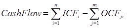 Де СashFlow – грошовий потік, що оцінюється; ICFi – i – ий – вхідний грошовий потік ( СashInflows ); ОCFj –j – ий – вихідний грошовий потік ( СashOutflows ). По-друге – непрямий метод розрахунку грошового потоку, перш за все, операційного, так, операційний грошовий потік суб'єкта господарювання відповідно до непрямого методу визначається як арифметична сума чистого прибутку підприємства, нарахованої протягом періоду амортизації та приросту абсолютної величини забезпечень: Cash Flow – операційний грошовий потік суб'єкта господарювання; Ni – чистий прибуток суб'єкта господарювання за період, що аналізується (Net Income); D – нарахована протягом періоду амортизація (Depreciation);