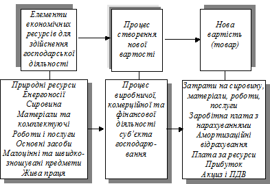 Рис. 2.4. Основні елементи господарської діяльності Господарську діяльність, можна розглянути як взаємодію основних економічних ресурсів (рис. 2.5). Результатом господарської діяльності є готова продукція, товари, роботи, послуги. При визначенні їх вартості враховують тільки ту частину затрат, яку люди несуть в процесі своєї діяльності при переробці та використанні певного матеріального ресурсу, і не враховується та частина затрат, яку понесла природа при створенні цього ресурсу (дерева, металу, каменю тощо). Останні затрати вважаються безкоштовними.