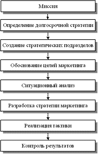 Рис.1. Схема стратегического планирования на предприятии Каждый этап имеет свое специфическое содержание для конкретных предприятий. В процессе стратегического планирования главные цели предприятия устанавливаются высшим руководством и согласуются со всеми подразделениями. Плановые службы предлагают каждому подразделению варианты первоначальных показателей валовой и нераспределенной (чистой) прибыли на долгосрочный период. После их рассмотрения подразделения выдвигают свои предложения и, тем самым, создаются необходимые предпосылки для выработки общих целей стратегического планирования. В утвержденных планах предусматриваются общие цели предприятия, его место на рынке, организационная структура управления, финансовые результаты и т.д.[2] Таким образом, основная задача стратегического планирования на предприятиях состоит в обосновании важнейших целей и выработке правильной стратегии долгосрочного развития. В современной теории планирования принято выделять восемь основных сфер деятельности, в границах которых каждое предприятие определяет свои главные цели. Этими сферами являются положение предприятия на рынке, инновационная деятельность, уровень производительности, наличие производственных ресурсов, степень стабильности, система управления, профессионализм персонала и социальная ответственность. Выбор цели и стратегии предприятия составляет основу самостоятельной планово-управленческой деятельности менеджеров. При стратегическом планировании предприятиями могут использоваться такие стратегии, как разработка товара, стабилизация производства, проникновение на рынок, сокращение издержек, изменение цен, а также целевые стратегии: как маркетинговая, производственная, финансовая, конкурентная и т.д. На российских предприятиях широкое распространение получила стратегия выживания, на зарубежных – завоевание лидерства на рынке.[3] Обычно используются три основные схемы перспективного планирования. 1. Снизу—вверх (децентрализовано). 2. Сверху—вниз (централизованно). 3. Интерактивно (во взаимодействии). Планирование снизу—вверх (характерно для диверсифицированных предприятий) означает, что цели отделений, стратегии их развития, производственные планы инициируются оперативными подразделениями предприятия. В прерогативу же планового отдела предприятия входит установление форм плановых документов и координация плановой При планировании сверху—вниз (характерном для предприятий, специализированных на производстве какой-то определенной продукции) базовая информация, задачи каждого подразделения и ключевые стратегии формируются на уровне предприятия в целом и служат для оперативных подразделений руководящей линией. Последние составляют в лучшем случае среднесрочные планы своего развития. Интерактивное планирование (которое наиболее широко распространено в настоящее время) представляет собой нечто среднее между двумя описанными выше схемами. В этом случае идеи формируются в процессе взаимодействия между высшим руководством, плановым отделом предприятия и его оперативными подразделениями. Высшее руководство устанавливает цели и направления деятельности предприятия. Стратегии формируются в процессе взаимодействия по вертикали по специально разработанным процедурам. Отдельные 