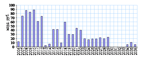 Рис.2. Государственный внутренний долг, выраженный в государственных ценных бумагах, млрд. руб[13] . Внутренний долг за последние 6 лет увеличился на 62,3% или на 321,3 млрд. руб. Но в долгосрочном плане правительства указывалось, что ожидаемый объем внутреннего долга в 2004-2005 годах, который рассчитан по потенциальному спросу и предложению на государственные ценные бумаги, мог возрасти до 1000 млрд. руб. (6,7% ВВП) на начало 2005 г. и до 1200 млрд. руб. (7,3% ВВП) на начало 2006 г[14] . Если проследить динамику внутреннего долга за 2006 год, то мы увидим, что на 1 января долг составил 851,122 млрд. руб., а на 1 сентября он равнялся уже 951,508 руб. [рис. 2] Увеличение внутреннего долга, наблюдающееся на протяжении последних лет, происходит в основном за счет прироста объема задолженности выраженной ОФЗ-АД, которая является, можно сказать, единственным инструментом на рынке, обладающим хорошей ликвидностью. В апреле 2005 г. Правительство РФ рассмотрело долговую стратегию на 2006-2008 гг. Два года назад был рассмотрен аналогичный документ на период 2003-2005 гг. В принципе документ сохраняет ту позицию, которую Минфин выбрал еще 2 года назад: государственный долг Российской Федерации и совокупный государственный долг должен уменьшаться по отношению к ВВП, при этом доля государственного внутреннего долга должна расти. Согласно этой стратегии планируется привлечь на внутреннем рынке за счет размещения государственных ценных бумаг 868,5 млрд. руб. при одновременном погашении рублевых облигаций на сумму 265,3 млрд. руб. За 3 года чистое привлечение по государственным бумагам составит 603,2 млрд. руб. Министерство финансов планирует ежегодно увеличивать объем рынка ГКО/ОФЗ на 115-150 млрд. руб. Государственный долг возрастет с 931,2 млрд. руб. на начало 2006 года до 1554,1 млрд. руб. на начало 2009 года.[15] Министерством финансов предусмотрена следующая долгосрочная стратегия в области погашения государственного внутреннего долга: