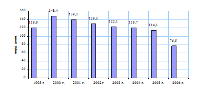 Рис.1. Структура государственного внутреннего долга, выраженного в государственных ценных бумагах, на 11.09.2006 г. Основное увеличение внутреннего долга произошло в период 1993-98гг., когда бурно рос рынок государственных ценных бумаг, выпускаемых для покрытия дефицита бюджета. Последовавшее за кризисом 1998 г. некоторое снижение в росте государственных заимствований сменилось их активным ростом, начиная с 2003 года. Так, если в 1996 г. внутренний долг составлял 76,76 млрд. руб., в 1997 г. - 248,98 млрд. руб., то в 2003 г. он возрос до 654,7 млрд. руб. На 1 января 2006 г. внутренний долг РФ составил уже 851,15 млрд. руб. [табл. 1]. Таблица 1. Государственный внутренний долг Российской Федерации, выраженный в государственных ценных бумагах, млрд. руб.[12]