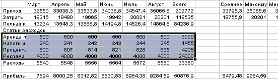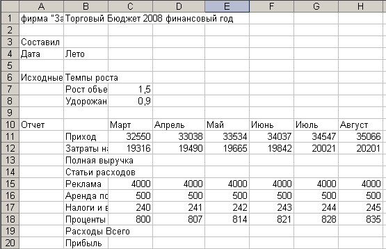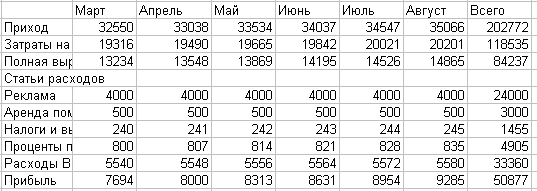 4. Маркером автозаполнения протащите блок вправо на 4 ячейки до ячейки H18. 5. В 6 ячейках появятся числа 800, 807, 814, 821, 828, 835 (прогрессия с шагом 7). 4.3. Не быстрый вводВ двенадцати ячейках, 2 раза по шесть ячеек, в ячейках C11:H11 и C12:H12 введите приходы и затраты на товары с марта по август. Столбец Всего и строку с полной выручкой не заполнять.
