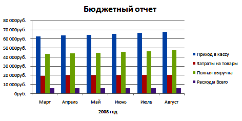 Рис 9.3. 8. Щелкните кнопку Названия осей и пункт меню Название основной горизонтальной оси\ Название под осью. Наберите с клавиатуры слова 2008 год. Нажмите клавишу Enter. Появится название горизонтальной оси. 9.2. Диаграмма замечает изменения в таблицеВ этом упражнении Вы увидите, что диаграмма является объектом и способна реагировать на внешние события, например, на изменения данных в таблице. 1. В ячейку С11 введите текст Приход в кассу. 2. В ячейку D11 вместо 32550 введите приход 62550. 3. Покиньте ячейку D11, нажав клавишу любой стрелки. Данные в строке 11 изменятся. Диаграмма автоматически отобразит изменения. Изменится надпись Приход в кассу в легенде справа, высоты столбцов, масштаб вертикальной оси.