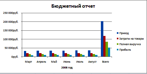 Рис 8.14. 7. Через раздел Стили, кнопку Стилиячеек, ячейку Обычный, пункт меню Изменить, окно Стиль, кнопку Формат, окно Форматячеек верните старые значения размера 11, цвета фона – нет цвета. 8. Нажмите кнопку ОК в окне Формат и в окне Стиль. Таблица вернется в нормальное состояние. 9. Построение диаграммГораздо нагляднее изобразить зависимости с помощью графиков и диаграмм. Можно составить графики, показывающие изменения Ваших величин во времени, или диаграммы, определяющие, какая доля целого приходится на отдельные его части. Важно, что, при изменении данных в рабочей таблице, диаграммы изменяются автоматически. Диаграмма, построенная прямо на рабочем листе, называется внедренной. Если диаграмма расположена на отдельном листе, то этот лист называют листом диаграммы. Диаграмма является объектом. Это значит, что: 1. Она умеет замечать внешние события. Например, она видит изменения данных, на основе которых построена. 2. Она умеет реагировать на внешние события. Например, она самостоятельно изменяет свое изображение. 3. Она полностью описывается перечнем и значениями своих свойств, например шириной, высотой, типом и др. К свойствам диаграммы можно добраться через правую кнопку мыши и пункты контекстного меню. 4. Диаграмма является контейнером и содержит в себе другие объекты. 9.1. Как создавать внедренные диаграммыЧтобы создать диаграмму на рабочем листе, нужно выделить данные, которые будут в ней использованы, и вызвать Мастер диаграмм. Вы можете выбрать как один ряд данных (отдельную строку или отдельный столбец), так и несколько. При построении круговых диаграмм, например, выделяют только один ряд данных. В следующем упражнении вы выберите данные для построения гистограммы и определите ее место на рабочем листе. 1. В ленте Разметка страницы в разделе Параметры листа поставьте флажок Сетка \ Вид. В таблице появится сетка. 2. На листе Бюджет 2008 выделите ячейки C10:I13 с названиями месяцев, приходами, затратами, выручкой за 6 месяцев. Нажмитеклавишу Ctrlи, удерживая ее, выделите мышью ячейки C19:I19 с Расходами Всего. 3. В ленте Вставка щелкните на кнопке Гистограмма и выберите самый верхний левый рисунок (Гистограмма с группировкой). Появится прямоугольная область с гистограммой.