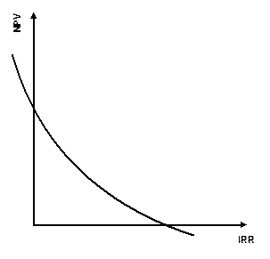 Метод кумулятивного построения применяется к проектам, для которых трудно подобрать удовлетворительные аналоги. В то же время компоненты рассчитанной таким образом ставки капитализации определяются статистическими методами. Сравнение критерия IRR и ставки капитализации R0 позволяет судить о том, насколько близка ожидаемая доходность проекта к нормальному уровню доходности в данном бизнесе. Это сравнение позволяет сделать следующие выводы. Если IRR > R 0 , то проект является более прибыльным, чем аналогичные проекты в среднем, и должен быть принят. В случае, когда IRR < R 0 , проект является менее прибыльным, чем аналогичные проекты в среднем. Наконец, при IRR = R 0 проект в коммерческом отношении не лучше и не хуже, чем аналогичные. Критерий IRR также целесообразно сравнить, например, с нормой вмененных издержек, IRR альтернативного проекта и некоторыми другими показателями. Независимо от того, с чем сравнивается IRR, очевидно одно: проект принимается, если его IRR больше некоторой пороговой величины; поэтому при прочих равных условиях, как правило, большее значение IRR считается предпочтительным. Легко заметить, что вопрос о выборе базы сравнения для критерия IRR и вопрос выбора ставки дисконтирования для расчета критерия NPV являются одним и тем же вопросом. В случае рассмотрения единичного проекта все рассмотренные критерии, основанные на учете временной стоимости денег, дают одинаковые рекомендации относительно принятия или отклонения проекта. Иными словами, проект, приемлемый по одному из этих критериев, будет приемлем по другим. Причина этого заключается в том, что между показателями NPV, PI и IRR имеются очевидные взаимосвязи: · если NPV > 0, то одновременно IRR > R и PI > 1; · если NPV < 0, то одновременно IRR < R и РI < 1; · если NPV = 0, то одновременно IRR = R и PI = 1. В то же время они не являются абсолютно взаимозаменяемыми. Принимая решение, инвестору желательно опираться на расчет всех вышеперечисленных критериев. Критерий NPV показывает в абсолютном выражении возможный прирост экономического потенциала коммерческой организации, а критерий IRR позволяет наиболее наглядно сравнить данный проект с другими возможностями инвестирования. Высокое значение NPV неможет быть единственным аргументом при выборе инвестиционного решения, так как оно во многом зависит от масштаба инвестиционного проекта и может быть связано с достаточно высоким риском. Каждый из критериев обладает своими плюсами и минусами, но критерий IRR не всегда может быть рассчитан. В случае неординарного денежного потока критерий IRR может иметь несколько значений или не иметь действительных значений вообще. Для наглядного понимания природы вышеперечисленных критериев рассмотрим график чистой приведенной стоимости, который является одним из наиболее полезных инструментов для суммарного выражения характеристик доходности инвестиции. Для построения графика данной функции на оси абсцисс будем откладывать значения ставки дисконтирования, а на оси ординат – чистую приведенную стоимость инвестиций. Чистая приведенная стоимость инвестиций изображается для всех ставок дисконтирования от нуля до какого-нибудь разумного большого значения. Для ординарного денежного потока данная функция является монотонно убывающей, и ее график имеет следующий вид.