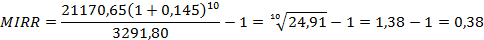 При этом должны соблюдаться следующие неравенства: ra <IRR< rb ; NPVa > 0 > NPVb . 0,2035 <0 ,2045 < 0,2055 26,98 >0> -24,72 Точность вычислений IRR зависит от интервала между ra иrb . Чем меньше длина интервала между минимальным и максимальным значениями ставки дисконта, когда функция меняет знак с «+» на «–» , тем точнее величина IRR . Модифицированная норма прибыли. Д анный показатель представляет собой коэффициент дисконтирования, уравнивающий приведенную стоимость оттоков денежных средств и наращенную величину притоков денежных средств, причем операции дисконтирования и наращения выполняются с использованием показателя стоимости капитала.