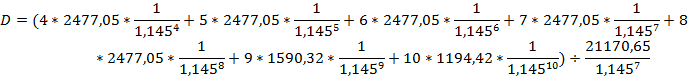 Дюрация ( D ) –это средневзвешенный срок жизненного цикла инвестиционного проекта, где в качестве весов выступают текущие стоимости денежных потоков, получаемых в период t. Она позволяет привести к единому стандарту самые разнообразные по своим характеристикам проекты (по срокам, количеству платежей в периоде, методам расчета причитающегося процента). Ключевым моментом этой методики является не то, как долго каждый инвестиционный проект будет приносить доход, а прежде всего то, когда он будет приносить доход и сколько поступлений дохода будет каждый месяц, квартал или год на протяжении всего срока его действия. Дюрация (средневзвешенный срок погашения) измеряет среднее время жизни инвестиционного проекта или его эффективное время действия. В результате менеджеры получают сведения о скорости поступления денежных доходов, приведенных к текущей дате. Для расчета дюрации ( D ) используется обычно следующая формула: