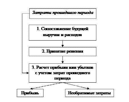 Рисунок 1 - Процесс принятия решений с учетом будущих доходов и расходов Вмененные (воображаемые) затраты. Данная категория присутствует лишь в управленческом учете. Бухгалтер финансового учета не может позволить себе «вообразить» какие-либо затраты, так как он строго следует принципу их документальной обоснованности. В управленческом учете для принятия решения иногда необходимо начислить или приписать затраты, которые могут реально и не состояться в будущем. Такие затраты называются вмененными. По существу это упущенная выгода предприятия. Это доходы по тому варианту решения, от которого мы отказались, принимая данное решение. Приростные и предельные затраты. Приростные затраты являются дополнительными и возникают в результате изготовления или продажи дополнительной партии продукции. В приростные затраты могут включаться, а могут и не включаться постоянные затраты. Если постоянные затраты изменяются в результате принятого решения, то их прирост рассматривается как приростные затраты. Если постоянные затраты не изменяются в результате принятого решения, то приростные затраты будут равны нулю. Предельные затраты - это затраты, которые приходятся на самую последнюю единицу продукции, произведенную предприятием. Этим понятием в основном пользуются в микроэкономике, а не в бухгалтерском учете. С точки зрения микроэкономики трудно выделить чистые переменные расходы. Переменные расходы могут изменяться по сравнению с объемами производства либо прогрессивно, либо дигрессивно, поэтому затраты материалов, заработная плата основных рабочих на единицу продукции с изменением объемов производства могут меняться. Правило оптимизации производственной программы предприятия можно сформулировать следующим образом: если предельные затраты равны цене единицы продукции, то в этом случае прибыль предприятия будет максимальной. 1.4. Классификация затрат для контроля и регулирования деятельности центров ответственности Рассмотренные выше классификации затрат не решают всех задач по контролю за ними. Как правило, продукция в процессе своего изготовления проходит ряд последовательных стадий в различных подразделениях предприятия. Располагая сведениями о себестоимости продукции, невозможно точно определить, как распределяются затраты между отдельными производственными участками (центрами ответственности). Эту задачу можно решить, если установить связь затрат и доходов с действиями лиц, ответственных за расходование ресурсов. Такой подход в управленческом учете назван учетом затрат по центрам ответственности. В целях контроля и регулирования уровня затрат применяется их следующая классификация: регулируемые и нерегулируемые; эффективные и неэффективные; в пределах норм (сметы) и отклонения от норм; контролируемые и неконтролируемые. Регулируемые - затраты, зарегистрированные по центрам ответственности, величина которых зависит от степени их регулирования со стороны менеджера. В целом на предприятии все затраты регулируемы, но не все затраты могут регулироваться на низших уровнях управления. Например, администрация предприятия имеет право регулировать приобретение производственных запасов, нанимать людей на работу, организовывать отдельные производственные участки, цехи и т.д. В то же время на такие затраты 