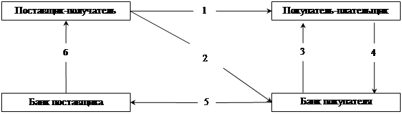 Рис. 2. Схема документооборота при расчетах платежными требованиями-поручениями (1 - отгрузка продукции, выполнение работ, оказание услуг; 2 - выписка комплекта платежных требований-поручений и пересылка его вместе с отгрузочными документами в банк плательщика; 3 - передача банком-плательщиком полученных документов для акцепта покупателя; 4 - возврат платежных требований-поручений с акцептом; 5 - направление документов из банка плательщика в учреждение банка, обслуживающего получателя; 6 - выписка с расчетного счета получателя о зачислении суммы. Особенности реквизитов платежного требования-поручения, отличающие его от всех остальных форм расчетов, состоят в том, что они отражают и сумму требования получателя денег, заверенную подписями должностных лиц и оттиском печати, и сумму, которую плательщик поручил банку списать со своего счета, также заверенную подписями должностных лиц и оттиском печати. Платежное требование-поручение выписывается поставщиком и вместе с отгрузочными и другими предусмотренными договором документами направляется в банк покупателя. Поступившее в банк плательщика платежное требование-поручение оплачивается покупателем только в порядке предварительного акцепта. Заявленный плательщиком отказ от акцепта может быть полным или частичным и обязательно должен быть мотивирован. Срок акцепта (полного или частичного) устанавливается в 3 рабочих дня, не считая дня поступления в банк расчетных документов. В случае неполучения банком акцепта плательщика по платежному требованию-поручению оно возвращается в банк поставщика с указанием, что расчетный документ не акцептован. Ответственность за обоснованность отказа от оплаты платежных требований-поручений несут плательщики. Споров по существу отказа от акцепта банки не рассматривают. Все возникшие разногласия должны решаться в претензионно-исковом порядке. Платежное требование-поручение принимается банком только при наличии средств на счете плательщика. Расчеты платежными требованиями-поручениями, так же как и платежные поручения, не требуют больших затрат на их проведение, однако скорость расчетов по ним несколько ниже. Они укрепляют договорные отношения в хозяйстве, так как их оформление осуществляет сам получатель платежа (поставщик) сразу же после отгрузки продукции или оказания услуг. Платеж совершается с согласия плательщика после предварительной проверки им расчетных и товарно-транспортных документов поставщика [6, с.87]. Аккредитивная форма расчетов. При расчетах по аккредитиву банк, действующий по поручению плательщика об открытии аккредитива, обязуется осуществить по указанию клиента одно из следующих действий: а) осуществить платеж третьему лицу; б) оплатить переводной вексель; в) акцептовать его; г) учесть вексель против представления получателем документов, определенных условиями аккредитива. Поручение клиента банку выставить аккредитив оформляется в виде заявления на аккредитив, в котором указываются следующие сведения: номер договора, по которому открывается аккредитив; срок действия аккредитива; наименование поставщика; наименование банка, исполнявшего аккредитив; место исполнения аккредитива; полное и точное наименование документов, против которых проводятся выплаты по аккредитиву; вид аккредитива с указанием, для от
