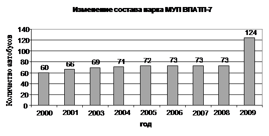 В результате реализации Мероприятий по обновлению подвижного состава муниципальных унитарных предприятий пассажирского транспорта Волгограда с применением лизинга на период 2007 - 2010 г.г. утвержденных решением Волгоградской городской Думы от 18.07.2007 г. № 48/1164 «О Мероприятиях по обновлению подвижного состава муниципальных предприятий пассажирского транспорта Волгограда с применением лизинга на период 2007 – 2010 годов» в 2008 году муниципальное образование – городской округ Волгоград получил 92 автобуса с целью использования на общегородских маршрутах . В 2008 году в результате реализации Мероприятий по обновлению подвижного состава на маршрутах пассажирского транспорта общего пользования с применением лизинга, утвержденных решением Волгоградской городской Думы от 18.07.2007 г.№ 48/1164, МУП «ВПАТП № 7»: - приняты к обслуживанию 8 дачных маршрутов с дополнительным привлечением 27 автобусов; - восстановлена работа на пяти автобусных маршрутах: № 2 с 20.06.2008 г. (6 автобусов); № 21э с 18.07.2008 г. (4 автобуса); № 23 с 01.09.2008 г. (2 автобуса); № 55 с 13.10.2008 г. (2 автобуса); № 59 с 01.12.2008 г. (4 автобуса); - увеличено количество автобусов на ранее обслуживаемых маршрутах на 14 автобусов; - с 01.07.2008 г. принят на обслуживание автобусный маршрут № 88 (железнодорожный вокзал – посёлок Максима Горького) с привлечением 10 автобусов [2]. На рисунке 2.1 приведена динамика изменения парка подвижного состава за период с 2000 по 2009 г.г.