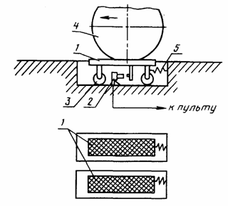 Рис. 3.1 - Схема площадного тормозного стенда. 1 – площадка; 2 – датчик; 3 – ролик; 4 – колесо; 5 – пружина; Методика диагностирования тормозов с его использованием заключается в разгоне автомобиля до скорости 6 - 12 км/ч и резком торможении при наезде колесами 4 на площадки 1 стенда. Если тормоза неэффективны, то колеса автомобиля прокатываются по площадкам стенда и последние не перемещаются. Если же тормоза эффективны, колеса затормаживаются и блокируются, а под влиянием сил инерции и сил трения между колесами и поверхностью площадок автомобиль перемещается вперед и захватывает с собой площадки. Значение не ограниченного пружинами 5 перемещения каждой площадки на роликах 3 воспринимается датчиками 2 и фиксируется измерительными приборами, расположенными на пульте. Основными преимуществами площадочных стендов являются их быстродействие, малая металло- и энергоемкость. Наиболее удобны стенды для проведения инспекторского контроля с выдачей заключения «годен - не годен». К недостаткам этих стендов следует прежде всего отнести низкую стабильность показаний из-за изменения коэффициента сцепления колес автомобиля с площадками (колеса мокрые, грязные и т. д.) и, заезда автомобиля с перекосом. Именно вследствие этих причин до сих пор не реализовано серийное производство этих стендов. Указанные недостатки отсутствуют у стендов с беговыми роликами (барабанами), получивших широкое распространение во всем мире. На рис. 3.2 приведена принципиальная схема тормозного стенда инерционного типа. Конструктивно он выполнен из двух пар барабанов, соединенных во избежание проскальзывания колес цепными передачами. Привод осуществляется от электродвигателя мощностью 55 - 90 кВт через редуктор и электромагнитные муфты, при отключении которых блоки барабанов становятся самостоятельными динамическими системами. Беговые барабаны соединены с маховыми массами. Физический смысл проверки эффективности тормозов на инерционном стенде заключается в следующем. Если в реальных условиях на дороге с помощью тормозных механизмов гасится кинетическая энергия поступательно движущегося автомобиля, то на стенде, где автомобиль неподвижен, за счет действия тормозов гасится энергия вращения барабанов и маховых масс, с которой «движущаяся дорога подкатывается под автомобиль». Для обеспечения имитации реальных условий маховые массы подбираются таким образом, чтобы момент инерции их и беговых барабанов при заданной скорости вращения обеспечивал кинетическую энергию, соответствующую кинетической энергии поступательно движущейся массы автомобиля, приходящейся на одну ось.