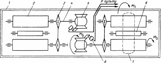 Рис. 3.2 - Схема тормозного стенда инерционного типа с беговыми барабанами: 1 - маховик; 2 - барабаны стенда: .3 - цепная передача; 4 - электромагнитная муфта, 5 - редуктор; 6 - электродвигатель Преимуществами тормозных стендов инерционного типа являются высокая степень точности и достоверности определения показателей (за счет обеспечения высокой стабильности коэффициента сцепления между колесами автомобиля и барабанами стенда), возможность испытаний тормозов в режимах, приближающихся к реальным, чем обеспечивается высокая информативность проверки. Однако стенды инерционного типа металлоемки (с инерционными массами до 5 т) и энергоемки. Наиболее целесообразно применение стендов данного типа при проведении приемочного контроля автомобилей с целью комплексной оценки их тормозных свойств [6]. Наибольшее распространение получили в настоящее время тормозные стенды силового типа, принципиальная схема которых показана на рис. 3.3.