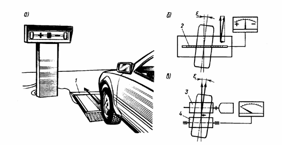 Рис. 3.5 - Средства контроля углов установки колес в динамическом режиме: а - проездной платформенный стенд; б - схема проездного реечного стенда; в - схема стенда с беговыми барабанами; 1 - платформа поперечного перемещения; 2 - рейка поперечного перемещения; 3 - ведущий барабан; 4 - ведомый барабан осевого перемещения. Когда углы установки колес не соответствуют требованиям, в пятне контакта возникает боковая сила, которая воздействует на платформу (рейку) и смещает её в поперечном направлении. Смещение регистрируется на измерительном устройстве. Какой угол установки колес надо регулировать, данные стенды не указывают. При необходимости дальнейшее обслуживание автомобиля выполняют на стендах, работающих в статическом режиме . Платформенные стенды устанавливают под одну колею автомобиля, реечные - под две. Автомобиль проезжает через стенд со скоростью примерно 5 км/ч. Стенды с беговыми барабанами предназначены для измерения боковых сил в местах контакта управляемых колес автомобиля с опорной поверхностью барабана. Для измерения боковых сил автомобиль устанавливают на стенде и включают электродвигатели бaрабанов. При помощи рулевого колеса, наблюдая за приборами, добиваются равенства боковых сил на обоих колесах. Если показания не соответствуют норме, регулируют схождение. В случае, если требуемого результата достичь не удалось, дальнейшее обслуживание автомобиля выполняют на стендах, работающих в статическом режиме. Стенды с беговыми барабанами в основном предназначены для автомобилей, у которых предусмотрена регулировка только схождения. Эти стенды металлоемкие и дорогостоящие, поэтому использовать их целесообразно только на крупных АТП [9]. Стенды, (приборы) для контроля углов установки колес в статическом режиме позволяют измерять углы: продольного и поперечного наклона оси шкворня, развала, соотношения углов поворота, схождения. Эти стенды получили наибольшее распространение из-за простоты конструкции и невысокой стоимости. Функциональные возможности стендов примерно одинаковые, основные различия - в принципе измерения. Измерение по уровню. На колесо автомобиля крепят прибор и по жидкостным уровням выставляют его «горизонт» (рис. 3.6, а). Поворачивая колеса вправо и влево, определяют, какой наклон получили уровни. Величина этих наклонов зависит от фактических значений углов установки колес. Отечественный прибор данного типа - М2142. Принцип уровня (или отвеса) заложен в измерительные системы большинства современных конструкций. Отклонение колеса от этих базовых положений считывается визуально, а в некоторых конструкциях автоматически и выдается на перфокарту или дисплей.
