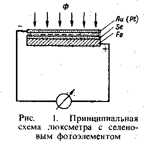 Другими словами, яркость характеризует поверхностную плотность силы света в данном направлении. Единица измерения яркости — кандела на метр квадратный (кд · м-2 ) — специального названия не имеет. Яркость — одна из всех световых величин, непосредственно воспринимаемая глазом наблюдателя. В инженерных решениях очень часто пользуются понятиями коэффициентов отражения Коэффициенты В инженерной практике оценка световых величин в основном сводится к измерению освещенности. Чаще всего это измерение производят с помощью приборов, называемых люксметрами. Основные части люксметра — фотоэлемент и миллиамперметр, градуированный в единицах освещенности — люксах. Наиболее широко применяют люксметры Ю-15, Ю-16 или Ю-17 с селеновым фотоэлементом. Принципиальная схема объективного люксметра показана на рис.1. Светочувствительный слой селена фотоэлемента наносят на стальную пластину. На поверхность селена напыляют тончайший (5 нм) полупрозрачный слой золота или платины. Между этими двумя слоями образуется так называемый «запирающий слой» с односторонней проводимостью. Стальная пластина и полупрозрачный слой являются двумя электродами.