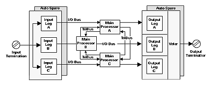 TRICON - это современная отказоустойчивая система управления, основанная на архитектуре с тройным модульным резервированием (TMR). TMR использует три изолированные параллельные системы управления и диагностику, объединенные в единую систему. Система, использующая принцип мажоритарной выборки "два – из – трех", обеспечивает высокую надежность, безошибочность и безостановочное функционирование, и не имеет ни одного слабого звена. Сигналы сенсоров во входном модуле разделяются и направляются по трем независимым и изолированным каналам к одному из трех главных процессоров. Межпроцессорная шина TRIBUS выполняет мажоритарную выборку данных и корректирует любые расхождения входных сигналов. В результате этого гарантируется, что каждый главный процессор использует одни и те же выбранные данные для выполнения прикладной программы. Выходные параметры затем направляются по трем различным каналам к выходным модулям, где вновь проводится мажоритарная выборка для обеспечения надежности. Цифровая мажоритарная выборка выходного сигнала осуществляется с помощью запатентованной схемы учетверенной выборки, выборка аналогового сигнала осуществляется с помощью аналогового выходного селектора. Схема с обратными связями обеспечивает конечную оценку состояния выходного сигнала и диагностику скрытых ошибок. Установка и запуск системы TRICON облегчается тем, что тройная система резервирования TMR с точки зрения пользователя, действует как одна система управления. Пользователь устанавливает и подсоединяет датчики и исполнительные механизмы к единой терминальной точке цепи и программирует TRICON с помощью одной прикладной программы. Диагностика каждого независимого канала, каждого модульного компонента и каждой функциональной цепи позволяет обнаруживать ошибки функционирования и сообщать о них. Все данные диагностики хранятся в качестве системных переменных, сообщения выводятся на соответствующие светодиодные индикаторы (LED) или на контакты тревожной сигнализации. Эта информация может быть использована в прикладной программе для изменения действий по управлению процессом или при техническом обслуживании. Все неисправные компоненты могут быть заменены в оперативном режиме без прерывания процесса! Эти особенности TRICON обеспечивают высочайшую надежность данной системы. Основные особенности системы TRICON: отсутствие слабых звеньев в системе;