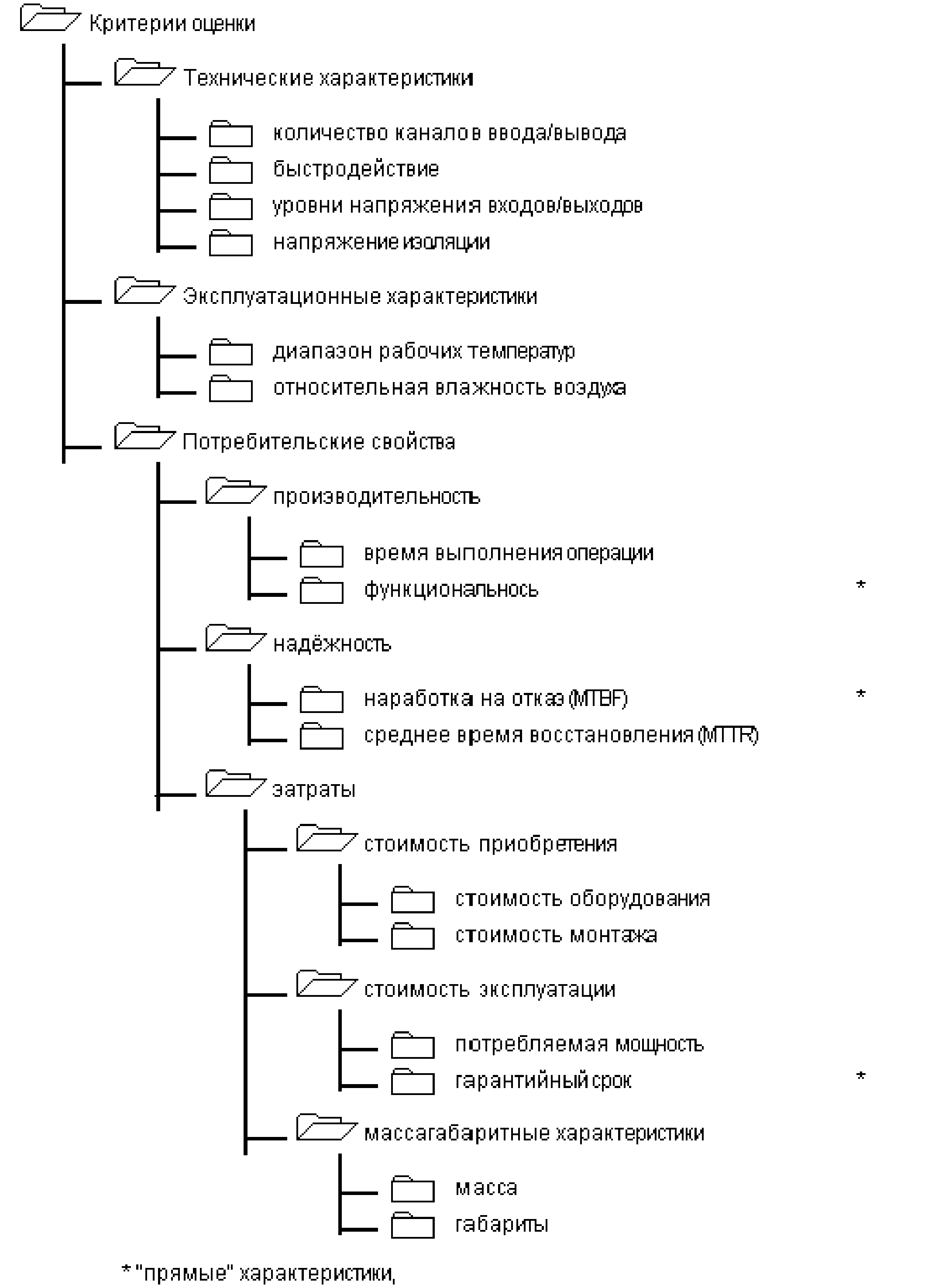 Также система TRICON сертифицирована Ассоциацией Технического Надзора (Германия) (TUV) для использования в производствах требующих “German Safety Requirement Class 5 and 6”. Приложение 4 Полевая шина - Fieldbus Современная микроэлектроника предлагает разработчикам технических информационных систем возможность добиться высоких характеристик при относительно низкой цене, позволяет реализовать функции автоматики вне блока центрального процессора, например, в станках, агрегатах, датчиках и исполнительных механизмах [19]. Такое смещение функциональности в сторону периферийного технологического оборудования (децентрализация) выявило потребность в новых видах коммуникаций. Прежде передача и обработка сигналов осуществлялась за счет простого включения в автоматизируемый процесс некоторого вычислителя, однако сегодня интеллектуальные компоненты автоматизируемого процесса требуют специально разработанных видов связей, действующих в рамках их собственной функциональности. Появление цифрового интерфейса сделало переход к локальной сети почти неминуемым. Этот вид сети, функционирующей на нижнем уровне системы автоматизации непосредственно рядом с технологическим процессом, получил название fieldbus (полевая шина, или промышленная сеть). К наиболее известным и применяемым в мире открытым промышленным сетям относятся: CAN, LON, PROFIBUS, Interbus-S, FIP, FF, DeviceNET, SDS, ASI, HART и некоторые другие. Каждая из перечисленных систем имеет свои особенности и области применения. Большие усилия направлены сегодня на разработку аппаратно-программных шлюзов (мостов) из одного протокола в другой. И эти решения составляют отдельный сегмент продуктов в области fieldbus-систем. Метод квалиметрии Vетод квилиметрии разработал видный русский математик, механик и кораблестроитель академик А.Н.Крылов. Название метода происходит от латинских слов qualis – какой по качеству и metreo – измерение, то есть измерение качества и обозначает отрасль науки, занимающейся и реализующая методы количественной оценки качества продукции. В настоящее время квалиметрия получила развитие и признание у специалистов. Квалиметрию можно рассматривать как часть исследования операций, объединяющую методы количественного обоснования решений, принимаемых в управлении и обеспечении качества как составной важной части эффективности продукции на всех этапах ее жизненного цикла –проектирования, производства и эксплуатации. Основная суть квалиметрического метода оценки характеристик программируемых логических контроллеров состоит в следующем: 1. Строится дерево свойств, показывающее взаимосвязи между сложными, простыми и элементарными свойствами. Дерево свойств строится в соответствии с рядом правил: 1) признак деления на свойства должен быть один и должен отражать данные однородные свойства, то есть смешивать разнородные свойства в группе нельзя; 2) лишние, дублирующие свойства не должны включаться в дерево свойств; 3) в дерево свойств должно быть включено минимальное количество свойств; 4) допускается включать в дерево свойства, которые не имеют критерия в конкретном выражении, но важны для оценки данного объекта. Далее проводится экспертиза дерева свойств специалистами на предмет соответствия поставленной задачи квалимитрической оценке, а также на предмет правильности его построения. При этом все пр