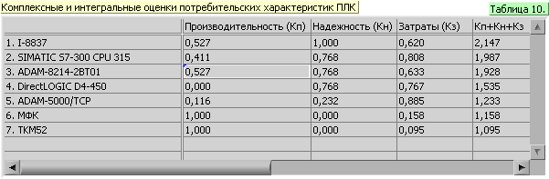 В результате анализа потребительских свойств аппаратуры составляется таблица изделия-потребительские свойства, которая содержит исходные данные для выбора ПЛК. Ранжирование изделий, т.е. расположение их в порядке возрастания (или убывания) соотношения показателей затраты/производительность/надежность целесообразно проводить по формуле: