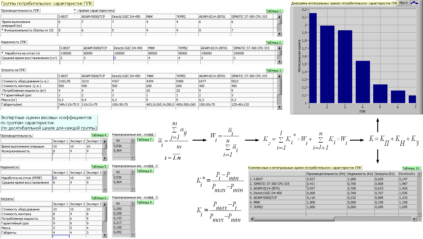 На первом этапе каждая техническая характеристика анализируемого изделия сравнивается с предъявленными к проектируемой системе требованиями, и если данная характеристика не удовлетворяет этим требованиям, изделие снимается с рассмотрения. Такой же анализ проводится на втором этапе с эксплуатационными характеристиками, и только если технические и эксплуатационные характеристики соответствуют поставленной задаче и предъявленным требованиям, проводится оценка потребительских свойств ПЛК. Для этого используется аддитивный метод оценки, когда суммарная оценка каждой группы свойств (затраты/производительность/надежность) вычисляется по следующей формуле: