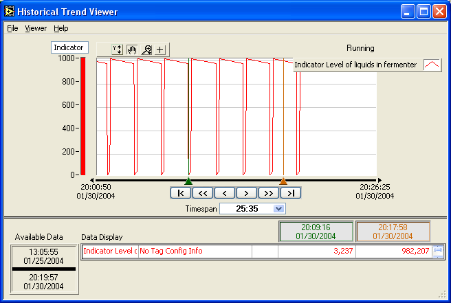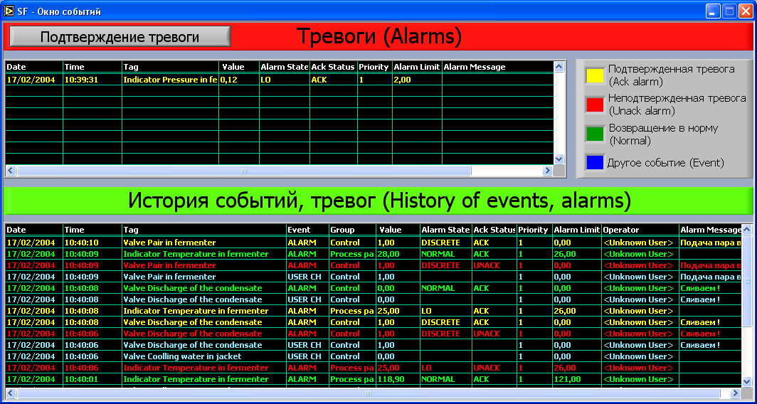 Рис. 8.11. Диаграмма, полученная 02-10-2003 в 16ч12м22с (название файла: 02-10-2003_16ч12м22с_term.log) 22.БЕЗОПАСНОСТЬ ПРОИЗВОДСТВАОсновные характеристики процесса биосинтеза эритромицина, определяющие его опасность Выпускаемый предприятием антибиотик – эритромицин производится путем биологического синтеза с помощью специально отселекционированного штамма микроорганизма. Микроорганизм – продуцент целевого вещества культивируют в специальных аппаратах на жидкой питательной среде, в строго асептических условиях, при непрерывном перемешивании, подаче стерильного сжатого воздуха для дыхания микробных клеток и охлаждении для отвода образующегося тепла жизнедеятельности микроорганизма. Данный процесс называют ферментацией, а аппараты, в которых он проводится – ферментерами. Растворы, содержащие питательные вещества, необходимые микроорганизмам для роста и развития («питательные среды»), готовят в специальной аппаратуре и перед ферментацией подвергают высокотемпературной (выше 120С) термической стерилизации с помощью водяного пара, вводимого непосредственно в жидкость («острый» пар). Затем стерильные питательные среды охлаждают до температуры культивирования 28 С. Также стерилизации подвергается ферментер и его обвязка. Для обеспечения стерильных условий в аппарате перед каждой ферментацией необходимо обеспечить температуру в аппарате 120 С при давлении 0,2 МПа. В ходе стерилизации обеспечивается автоматическое регулирование температуры и давления в аппарате, трубопроводной обвязки и запорно-регулирующей арматуре (подачей острого пара). Во время ферментации обеспечивается автоматическое регулирование температуры жидкости в аппарате (подачей охлаждающей воды в рубашку аппарата), показателя рН (подачей 20% раствора серной кислоты H2SO4 или 10% раствора щелочи NaOH), расход подаваемого стерильного воздуха, скорости вращения мешалки и других параметров процесса. По завершении ферментации, длящейся около 9 суток, получают вязкую водную суспензию микробных клеток и их фрагментов («культуральную жидкость»), содержащую антибиотик. Таким образом, при производстве эритромицина основными факторами, характеризующими опасность этого производства являются: