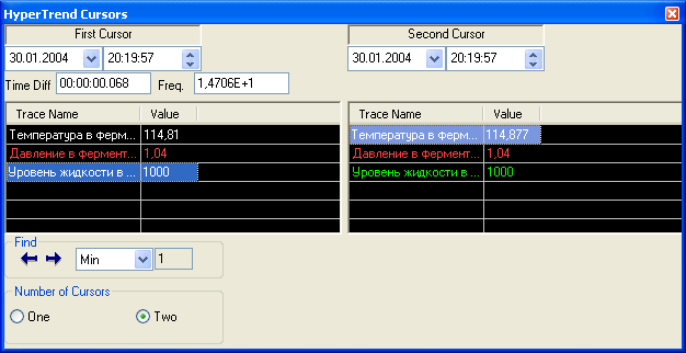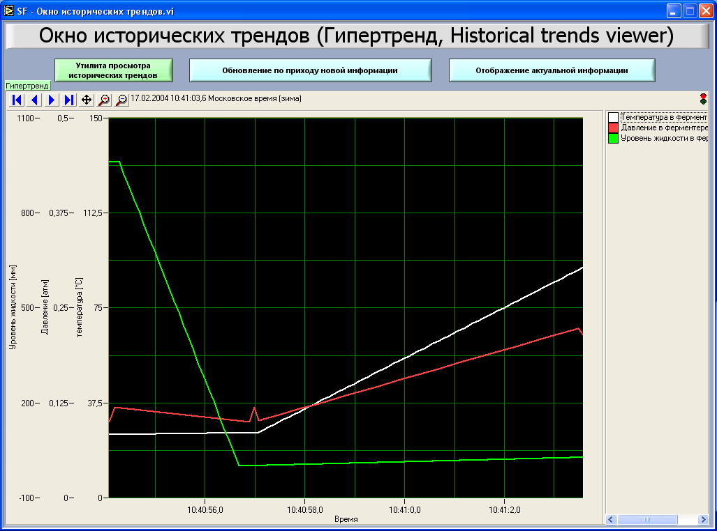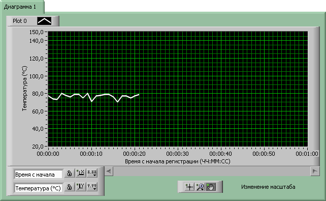 При нажатии происходит завершение работы программы. В центральной части окна находится диаграмма (тренд), отображающая показания прибора (температуру) во времени (рис 8.6). В текущей реализации программы опрос состояния прибора идет с интервалом 10 с. Вывод измерений в файл и отображение на диаграмме - с интервалом 10 с.