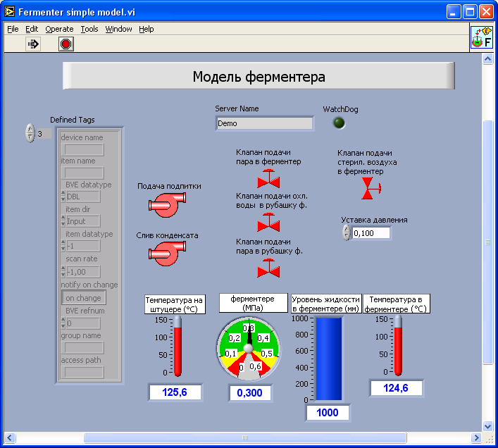 Аннотация В данном дипломном проекте в рамках разработки системы автоматизированного управления стадии стерилизации процесса биосинтеза эритромицина проведена работа в следующих направлениях: Рассмотрена задача создания автоматизированной системы управления стадии стерилизации биореактора процесса биосинтеза. Подтверждена актуальность данной задачи, произведен выбор метода автоматизации, обоснован выбор программно-технического комплекса и программного обеспечения для ее решения. Создано программное обеспечение для автоматизированного рабочего места оператора с использованием LabVIEW 7 DSC. Разработана программная реализация алгоритмической схемы переключений в процессе стерилизации биореактора на базе программного пакета LabVIEW 7 DSC. Предложена модель системы сбора, обработки и передачи технологической информации на базе АРМ оператора с использованием программной реализация алгоритмической схемы переключений, компьютерной модели процесса стерилизации и технологии OPC. В рамках САУ разработана программа управления измерителем температуры регулирующим «Дана-Терм» ИТР 2529 c функциями OPC сервера в программной среде LabVIEW 7 DSC. ОГЛАВЛЕНИЕ 2. КРАТКОЕ ОПИСАНИЕ ТЕХНОЛОГИИ ПРОИЗВОДСТВА ЭРИТРОМИЦИНА 4 5. АНАЛИЗ ФЕРМЕНТЕРА В КАЧЕСТВЕ ОБЪЕКТА УПРАВЛЕНИЯ САУ СТАДИИ СТЕРИЛИЗАЦИИ БИОРЕАКТОРА 13 6. ВЫБОР СРЕДСТВ ПРОГРАММНО-ТЕХНИЧЕСКОГО КОМПЛЕКСА 15 7 Программируемый логический контроллер (ПЛК) и сопутствующие технологии автоматизации 16 8 Сетевой комплекс контроллеров 18 9 Выбор контроллерных средств (ПЛК) 19 10 Выбор средств программирования контроллеров. 28 11 Выбор программного обеспечения верхнего уровня. SCADA системы 31 12. РАЗРАБОТКА СИСТЕМЫ АВТОМАТИЗИРОВАННОГО УПРАВЛЕНИЯ СТАДИИ СТЕРИЛИЗАЦИИ БИОРЕАКТОРА 36 13 Автоматизированное рабочего место оператора. Интерфейс оператора 36 14 Компьютерная модель стадии стерилизации биореактора 53 15 Реализация программно-логического управления стадией стерилизации биореактора. 56 17 Описание программы управления измерителем температуры регулирующим «Дана-Терм» ИТР 2529 59 18 Работа с программой управления (2529.exe) 61 21 Внедрение программы управления измерителем температуры регулирующим «Дана-Терм» ИТР 2529. 71 1.ВВЕДЕНИЕПроцессы биосинтеза (ферментации) занимают важное место в медицинской, пищевой, микробиологической и других отраслях промышленности. Несмотря на их большое разнообразие, процессам периодической ферментации принадлежит ведущая роль как наиболее изученным и гибким с точки зрения получения промежуточных и конечных продуктов требуемого качества. Значительные капитальные и эксплуатационные вложения, которыми характеризуются системы ферментации, связанны с использованием дорогостоящего оборудования и значительными энергетическими затратами. Основное оборудование: биореакторы (ферментеры), емкостные аппараты, трубопроводы, запорно-регулирующая арматура, – необходимо изготавливать из высококачественной нержавеющей стали. Непрерывное обеспечение культуры в ферментере стерильным воздухом, поддержание стабильного теплового режима, большой расход пара во время стерилизации и т.д. требуют обеспечения высокой степени надежности оборудования, узлов и механизмов, систем управления точности их технологического проектирования. К настоящему времени выполнено большое количество 