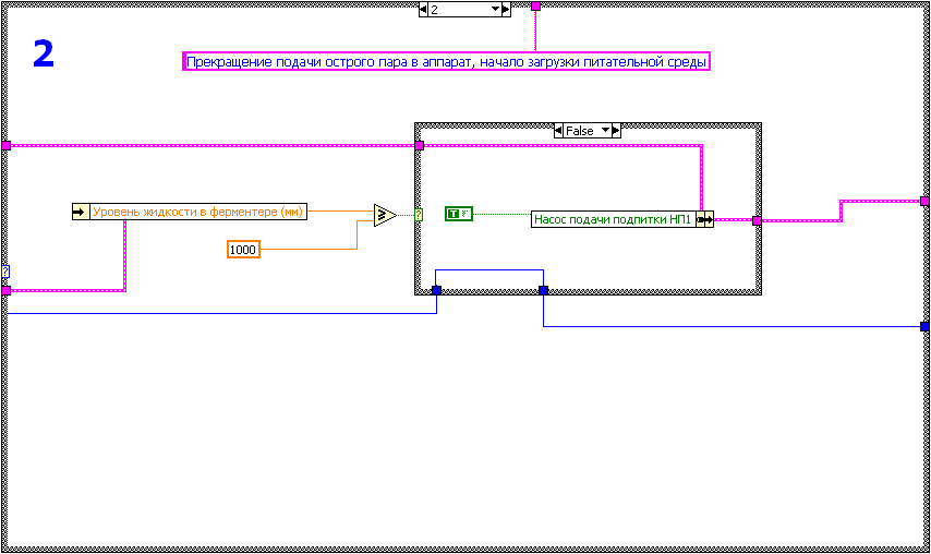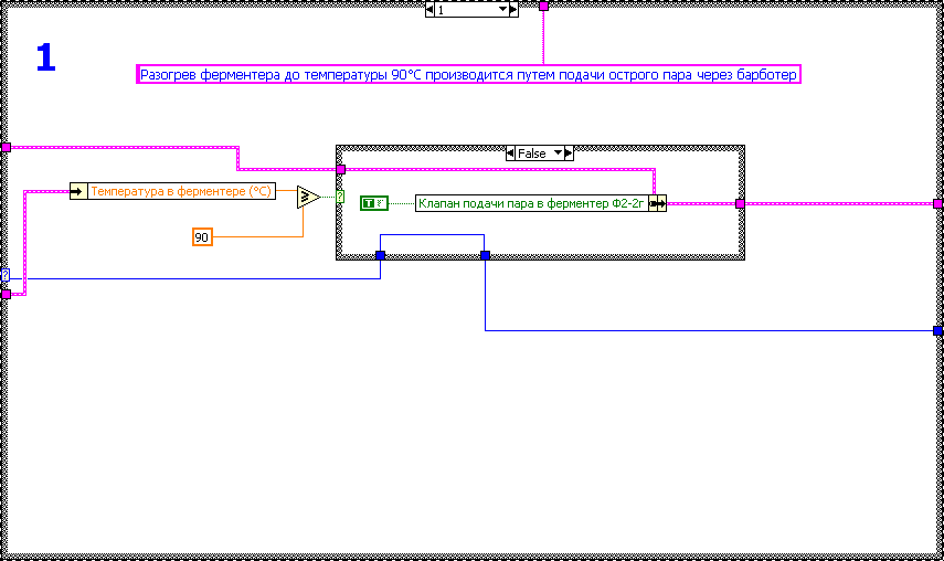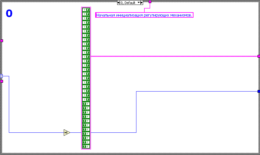 Таким образом, реализация алгоритма программно-логического управления стадией стерилизации с применением технологий LabVIEW и его совместное использование со SCADA системой для управления моделью процесса позволяют создать на базе Labview мощный инструмент отладки и апробирования различных алгоритмов управления, разрабатываемой системы диспетчерского управления и сбора данных без использования дорогостоящего технологического оборудования, а также позволяет совершенствовать компьютерную модель стадии стерилизации. Реализация алгоритма программно-логического управления на базе LabVIEW DSC Опираясь на регламент проведения стадии стерилизации, описанный в разделе «Краткое описание технологии производства эритромицина», с использованием программной среды LabVIEW DSC был разработан алгоритм управления стадией стерилизации. Алгоритм реализован в виде блок-диаграммы LabVIEW, оформленной в отдельный блок программно-логического управления (рис.7.11). Базовые элементы (кадры) реализации алгоритма программно-логического управления проиллюстрированы на следующей серии рисунков рис. 7.12 (Кадры алгоритма управления 0-2). Полная блок-диаграмма приведена в приложении 15.