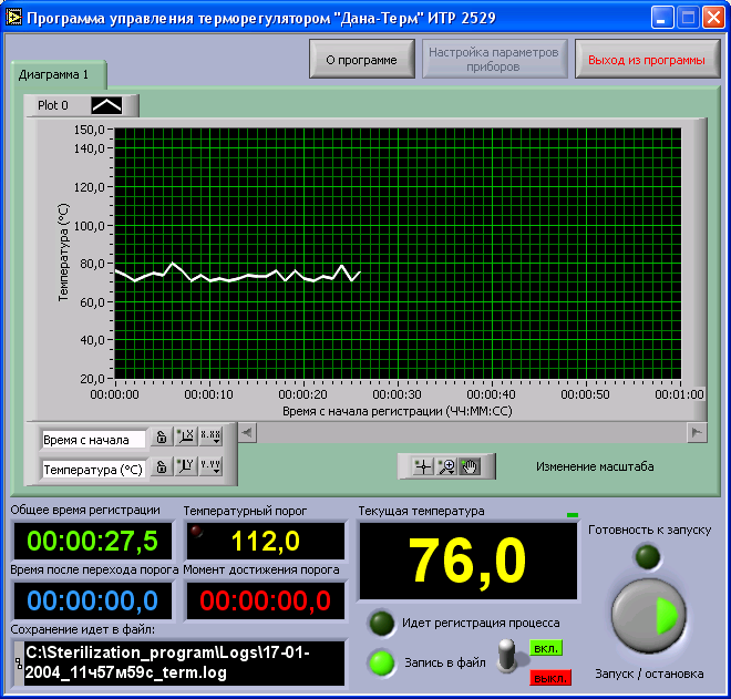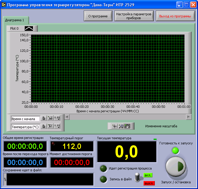 Включить запись в файл. Выключить запись в файл. Н Текущее значение температуры (в текущей реализации программы обновление раз в 10 сек).