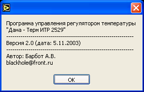 Рис 8.1. Диалог выбора и настройки COM порта Более подробное описание настройки и работы с драйвером содержится в файле: Использование DINdrv – драйвера для организации соединения измерителя температуры регулирующего ИТР 2529 с компьютером.doc” из каталога DOCS. Для запуска программы (при отсутствии среды разработки LabVIEW) необходимо установить библиотеки поддержки (lvrteinstall.exe). 18Работа с программой управления (2529.exe)Запуск программы осуществляется файлом 2529.exe. После запуска программы на экране появляются: рабочая панель программы и окно драйвера инструментальной сети “Дана – Терм” (DINdrv). Внешний вид рабочей панели программы При запуске программы активируется рабочая панель, включающая в себя различные элементы управления и индикации (рис 8.2, рис 8.3). Блок-диаграммы программы приведены в приложении 14.