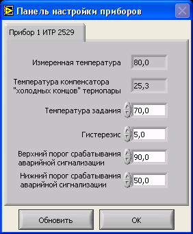 Рис 8.7. Панель настройки приборов В текущей версии программы поддерживается возможность настройки нескольких приборов, для этого требуется добавить в программный код “Панели настройки приборов” уникальные параметры подключаемого прибора (префиксы команд, команды, поля настроек соответствующих параметров). Для настройки параметров прибора ИТР 2529 (соответствующая вкладка) служат следующие поля ввода: