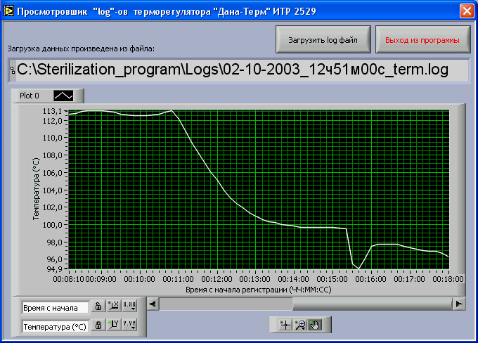При нажатии происходит завершении работы с панелью настройки приборов. 19Файл конфигурацииФайл конфигурации программы управления измерителем температуры регулирующим "Дана – Терм” ИТР 2529. (в данной реализации программы файл “Temper.ini”) содержит в себе некоторые настройки, необходимые для корректной работы приложения, а также настройки облегчающие работу с данной программой Этот файл имеет стандартную структуру конфигурационных файлов настройки “WINDOWS” приложений и описывается следующим синтаксисом: [раздел 1] ; комментарий имя ключа 1=значение ключа 1 …… имя ключа n=значение ключа n …… [раздел N] …… Листинг файла Temper.ini. [general] ; Разрешения записи в файл по умолчанию ("0"/"1", "True"/"False"). Save=True ; Пути указываются в полном (абсолютном) виде, например: "c:Dindrv". ; Каталог в который будут сохраняться показания прибора (если каталог по ; указанному пути отсутствует, он создается). Logs_path=C:Sterilization_programLogs ; Каталог в котором находится драйвер DINdrv. DINdrv_path=C:Sterilization_programDindrv ; Уровень температуры, который необходимо достичь. Temperature_level=112 ; Настройки диаграмм. ; Максимальные и Минимальные значения координат осей (в сек.) ; Во время работы программы интервал между макс. и миним. ; значениями координат сохраняется. Graph1_XScaleRangeMinimum=0 Graph1_XScaleRangeMaximum=600 Graph1_YScaleRangeMinimum=20 Graph1_YScaleRangeMaximum=150 20Работа с программой просмотра “log” файлов регулятора температуры «Дана-Терм» ИТР 2529 (Log_view.exe)Запуск программы осуществляется файлом Log_view.exe. После запуска программы на экране появляются рабочая панель программы (рис. 8.8)