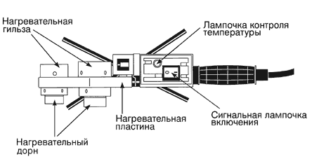 * - при прокладке в грунтах с агрессивной средой – до 5 лет; Полиэтиленовые трубы обладают: 1) Высокой коррозийной стойкостью к транспортируемым жидкостям и химически нейтральны ко всем веществам; 2) Повышенной пропускной способностью (при одинаковом диаметре на 20-30% выше, чем у стальных труб); 3) Высокой механической прочностью (растяжение на разрыв от 350 до 800%); 4) Коррозийной стойкостью ко всем видам грунтов; 5) Низким удельным весом (в три раза меньшим, чем у стали). Кроме этого: . 1) Полиэтиленовые трубы не зашлаковываются и не зарастают изнутри, не подвержены электрохимическим реакциям и действию блуждающих токов. 2) Возможна многократная заморозка трубопровода без его разрушения. 3) Полиэтиленовые трубы диаметром до 110 мм включительно могут поставляться в бухтах до 400 м, что значительно повышает скорость монтажа (в 3-7 раз выше, чем стальных труб). 4) Затраты по транспортировке материалов к месту работ и на сварочно-монтажные работы для полиэтиленового трубопровода ниже, чем стального. Системы трубопроводов из полипропилена пригодны для всех известных видов прокладки: открытой прокладки, прокладки под штукатуркой, в шахтах и каналах и др. Соединение пластмассовых деталей производится с помощью специального оборудования методом термической сварки в раструб. Соединение пластмассовых труб с металлическими трубами производится с помощью комбинированных и фланцевых деталей. Для сварки пластмассовых деталей используют специальный сварочный аппарат. Общий вид сварочного аппарата представлен на рисунке:
