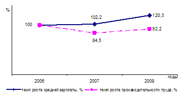 Рисунок 1. Динамика темпов изменения производительности труда и средней зарплаты на ОАО «Салаватский пищевик» Как можно видеть темп роста заработной платы выше роста производительности труда, особенно существенно проявляющихся после 2006г., когда при снижении производительности труда увеличивается заработная плата. Рассчитаем коэффициент опережения, который дает характеристику относительной эффективности управления трудом за счет изменения зарплаты. Коэффициент рассчитывается по формуле: Ко = Тр(пр-ти) /Тр(зп), где Тр(пр-ти) – темп роста производительности труда персонала, % Тр(зп) – темп роста средней зарплаты, % Для предприятия и его экономической целесообразности необходимо, чтобы коэффициент опережения (превышение темпа роста производительности труда над темпом роста зарплаты) был выше 1,0. В данном случае коэффициент опережения составляет: 2007/2006 – 84,5/102,2 = 0,827 2008/2007 – 92,2/120,3 = 0,766 Коэффициент не только ниже единицы, но и снижается за три года. Это означает, что рост зарплаты не согласовывается с изменением производительности труда. Следует либо повысить производительность труда, либо снизить зарплату. Поскольку второе нельзя сделать (законодательством запрещено снижать базовый размер заработной платы), следует разрабатывать систему мер по повышению производительности труда в рамках управления кадрами предприятия. Проведенный расчет показывает недостаточную эффективность сферы кадрового менеджмента, отвечающую за создание условий труда (в том числе и за счет системы оплаты труда) и управления этой сферой. Также можно выявить проблемы в формировании оптимальной системы трудовой мотивации. Эффективность кадрового менеджмента также можно оценить и по показателям движения персонала не только внутри (что было проанализировано), но и при взаимодействии предприятия с внешней средой. Таблица 3 Динамика движения персонала на ОАО «Салаватский пищевик» в 2007-2009гг