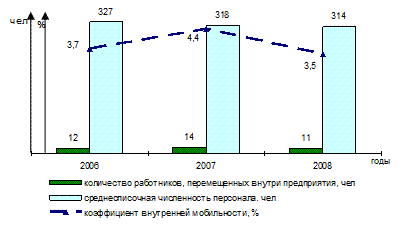 Рисунок 2. Динамика внутренней мобильности персонала ОАО «Салаватский пищевик» Коэффициент мобильности в 2008г по отношению к 2007г несколько увеличился (на 0,7%), а в 2009г по отношению к 2008г снизился, причем ниже уровня 2007г. Это означает снижение внутренней мобильности персонала. В целом внутренняя мобильность работников предприятия за три года снижается на 5,4%, что показывает достаточную степень важности активизации внутреннего движения не только для предприятия, но и для самих работников. Таким образом, в результате проведенного анализа деятельности объекта исследования выявлена необходимость внедрения современных технологий кадрового менеджмента, которые в настоящий момент либо не используются вовсе, либо используются ограничено и фрагментарно, что не позволяет получить необходимый от их использования эффект. Практическая значимость исследования для ОАО «Салаватский пищевик» обусловлена тем, что внедрение в практику управления персоналом не только позволит развивать кадровый менеджмент в наиболее перспективном направлении, но, и даст хороший экономический эффект. Совершенствование отдельных элементов кадрового менеджмента повлияет на улучшение всей системы управления и повысит производительность труда как основной фактор экономического развития производственного предприятия. ЗАКЛЮЧЕНИЕКадровый менеджмент – это необходимая сторона деятельности любой организации. На каждом этапе развития организации перед менеджерами по кадрам стоят особые задачи. Стадия стабильности характеризуется устойчивостью производства, поиском новых покупателей, поиском путей снижения затрат. Это касается и кадровой службы, поэтому все мероприятия, которые она проводит, направлены на то, чтобы эффективно использовать персонал. На стадии стабильности наиболее существенны вопросы оценки и эффективности труда, аттестации персонала, формирования кадрового резерва, разработки системы стимулирования труда. В последнее время все большее количество руководителей осознают важную роль персонала в хозяйствующих субъектах и приходят к выводу о том, что только целенаправленная и постоянная работа с персоналом может принести успех. Главной задачей руководства становиться нахождение таких принципов и механизмов, которые позволят создавать эффективную систему управления персоналом, ориентированную на взаимовыгодное сотрудничество организации и ее сотрудников. Для построения эффективной системы управления персоналом необходимо наличие целенаправленного управленческого воздействия на персонал, которое обеспечивается в процессе кадрового менеджмента. В современной литературе нет четкого определения кадрового менеджмента. Одни авторы полагают, что кадровый менеджмент – это новая парадигма управления персоналом современной организации с точки зрения ценности человеческих ресурсов. Другие авторы полагают, что кадровый менеджмент – это один из элементов общей деятельности по управлению персоналом организации в части формирования кадрового развития предприятия. И те и другие позиции схожи в том, что оценивают работников как голову предприятия, его основную ценность и предполагают использование связанных с этим методов управления. Однако для отечественных кадровых служб, пока еще только овладевающих азами кадрового м