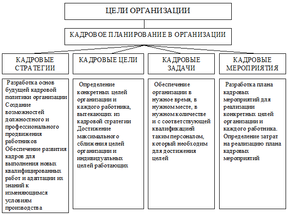 Для всех организаций – больших и малых, коммерческих и некоммерческих, для любых предприятий управление людьми имеет важное значение. Без людей нет организации. Без нужных людей, без специалистов ни одна организация не сможет достичь своих целей и выжить. Несомненно, что управление людьми, т.е. трудовыми ресурсами является одним из важнейших аспектов теории и практики управления. Глава 1. Основы планирования персонала. 1.1 Понятие, функции и принципы планирования персонала. Планирование персонала (эквиваленты, встречающиеся в литературе - кадровое планирование, планирование рабочего состава предприятия) определяется как "процесс обеспечение организации необходимым количеством квалифицированного персонала, принятым на правильные должности в правильное время". По другому определению, планирование персонала - это "система подбора квалифицированных кадров, при использовании двух видов источников - внутренних (имеющиеся в организации служащие) и внешних (найденные или привлеченные из внешней среды), имеющего своей целью обеспечить потребности организации в необходимом количестве специалистов в конкретные временные рамки".Эти определениявзяты из американских источников. А вот следующее - результат разработки наших, отечественных специалистов. “Кадровое планирование - это направленная деятельность организации по подготовке кадров, обеспечению пропорционального и динамичного развития персонала, расчету его профессионально - квалификационной структуры, определению общей и дополнительной потребности, контролю за его использованием”. Как видно, зарубежные источники концентрируют внимание главным образом на планировании потребности организации в кадрах, тогда как отечественные принимают это лишь в качестве одного из видов кадрового планирования, выделяя кроме того еще ряд понятий (планирование использования персонала, планирование его обучения и так далее. Главнейшая задача планирования персонала - это "перевести" имеющиеся цели и планы организации в конкретные потребности в квалифицированных служащих, т.е. вывести неизвестную величину необходимых работников из наличного уравнения планов организации; и определить время, в которое они будут затребованы. И как только эти неизвестные величины будут найдены, в рамках кадрового планирования необходимо вывести, составить планы достижения выполнения этих потребностей. По-существу, каждая организация использует кадровое планирование, явно или неявно. Некоторые организации проделывают в этом плане серьезные исследования, другие ограничиваются поверхностным вниманием в отношении планирования персонала. Как бы там ни было, но долговременный успех любой организации, несомненно зависит от наличия необходимых служащих в необходимое время на правильно выбранных должностях. Организационные цели и стратегии достижения этих целей имеют значение лишь тогда, когда люди, обладающие требуемыми талантами и умением, занимаются достижением этих целей. Недобросовестно выполненное, и тем более - вовсе проигнорированное, кадровое планирование способно спровоцировать серьезные проблемы уже в самое короткое время. Вряд ли реально выйти на улицу и сразу найти человека, обладающего необходимыми характеристиками. С помощью же эффективного кадрового планирования можно “запо