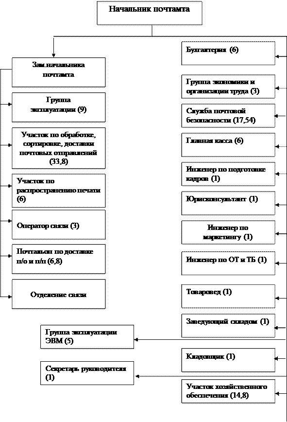 Рисунок 1- Структура …………………. ПОЧТАМТ Из рисунка 1 видно, что структура компании линейно-иерархическая, соблюдается строгое распределение должностных обязанностей. Производственная практика показала, что в данной организационной структуре в принципе недостатки малозначительны и все конечные решения принимает только начальник. Так функции начальника дублируются его заместителем, который может контролировать группу эксплуатации, участок по обработке, сортировке, доставки почтовых отправлений, участок по распространению печати, операторов связи, почтальонов по доставке, отделение связи этого в принципе достаточно, что бы предприятие нормально функционировало при краткосрочном отсутствии начальника, при более длительном отсутствии на заместителя возлагаются все функции начальника. Отдел «Группа эксплуатации ЭВМ» как и секретарь руководителя выделены в отдельное звено и осуществляют свою производственную деятельность, направленную на эффективное функционирование ………………… ПОЧТАМТ, в части работ, касающихся персональных компьютеров (ПЭВМ), контрольно-кассовых аппаратов (ККМ), почтово-кассовых терминалов (ПКТ), пункта коллективного доступа (ПКД), сигнализации, службы обмена электронными сообщениями, а также организационно-контрольной деятельности по установленному направлению. Отдел «Группа эксплуатации ЭВМ» руководствуется в работе действующими законодательствами Российской Федерации, государственными организационно-методическими и общетехническими стандартами, руководящими документами, распорядительными документами, утвержденными в установленном порядке планами, а также настоящим положением. 1.3 Задачи и виды деятельности отдела «Группа эксплуатации ЭВМ» · технический ремонт и профилактическое обслуживание ПЭВМ, ККМ, ПКТ, ПКД, ведение необходимой документации. · регистрация и перерегистрация ПКТ и ККМ в налоговых органах. · контроль состояния, оперативный учет, приобретение необходимых расходных материалов, оборудования и комплектующих для ПЭВМ. · обеспечение работоспособности электротехнического оборудования ПОЧТАМТ, качественной проводки сигнализации и аналогичного оборудования, своевременного профилактического обслуживания. · сопровождение и доработка программного обеспечения в рамках возможностей, представленными разработчиками программ. · системное администрирование и сетевое администрирование сети. · координация работ по выбору необходимого аппаратного обеспечения при создании и эксплуатации локальных и глобальных сетей. · обеспечение функционирования службы передачи данных (службы обмена электронными сообщениями) и данных с использованием сети Интернет. · осуществлять в рамках своих полномочий организационно-методического и технического руководства работами по вопросам компьютеризации, проведения начального обучения пользователей с новыми программными продуктами. · выявление потребности и составление совместно с руководством РУПС планов специалистов по закрепленным направлениям. 2 Анализ конъюнктуры рынка При анализе конъюнктуры рассматриваются факторы общего внешнего окружения: экономические, политические, правовые, научно-технические, социально-культурные. А также проводится анализ ближайшего внешнего или отраслевого окружения. а) экономические факт