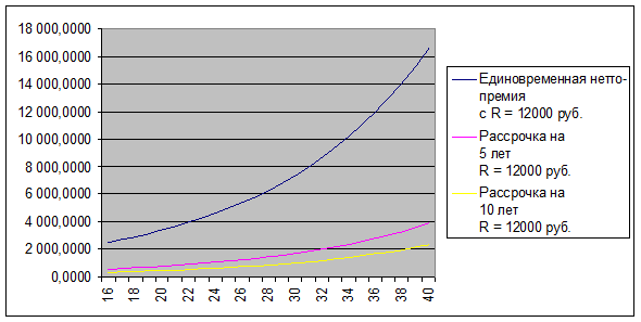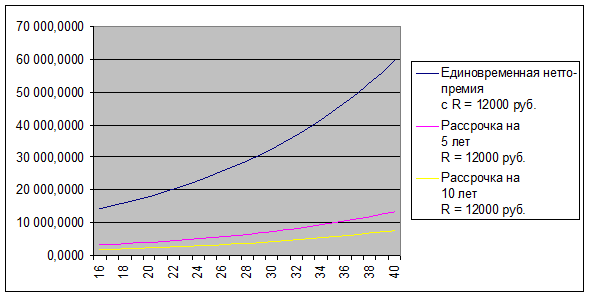 Рис. 2.3. Размер нетто-премий для мужчин при размере пенсии 12000 руб. в год и ставке 6%