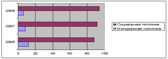 По данным таблицы 12 в основном средства Жигулевского филиала ФСС направляются на осуществление социальной политики государства. В 2007 году по сравнению с 2006 годом доля средств на молодежную политику, связанную с оздоровлением детей уменьшилась на 3,6%, а в 2008 году по сравнению с 2007 годом произошло дальнейшее снижение, которое составило 2,1%. Соответственно удельный вес расходов, направляемых на социальную политику, увеличивался в течение трех исследуемых лет. На рисунке изобразим динамику показателей структуры расходов Жигулевского филиала ФСС за 2006-2008гг.