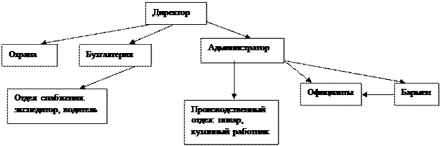 Рис. 3.1 Структура управления ООО «Мечта» Данная структура управления, на наш взгляд, более полно отвечает целям и задачам строительства холдинга его главной цели, а также целям ООО «Мечта»:предоставить полноценный отдых людям, имеющим средний достаток при сохранении хорошего уровня рентабельности и прибыльности. Администратор перестанет выполнять функции бухгалтера, они будут возложены на бухгалтерию. При такой структуре управления, администратор сможет сосредоточиться на приеме клиентов, при необходимости сможет поддержать с ними беседу, создать уютную обстановку, контролировать работу официантов и бармена. В случае отсутствия администратор делегирует свои функции бармену. В дневные часы, когда посетителей в кафе немного, администратор сможет исполнять функции экспедитора. Такая структура управления повысить контроль за работой официантов, позволит лучше их настраивать на вежливое предупредительное отношение с посетителями. При необходимости администратор сможет подстраховать официантов, если при большом наплыве посетителей им потребуется помощь. Заключение Выполнив данную работу мы пришли к выводу, что действия по разрешению проблем связанных со структурой необходимо предпринимать как можно раньше. Проблемы структуры являются хроническими, но не острыми. С ними можно мириться некоторое время, однако с ростом конкуренции и в условиях изменяющейся рыночной ситуации, они могут стать серьёзным препятствием на пути к успешной деятельности. В работе нами сделана попытка анализа структуры управления ООО «Мечта» и предложен вариант новой структуры управления для него. Предложенная нами структура является гибкой и органичной, однако, она потребует несколько больших затрат на выполнение управленческих функций, но существенно повысит эффективность деятельности ООО «Мечта». Список использованной литературы и источников 1. Конспект лекций по курсу «Менеджмент» 2. ГерчиковаИ. Н. Менеджмент. Учебник Третье издание. - М.: ЮНИТИ, 2002. 3. Мескон М. X., Альберт М., Хедоури Ф. Основы менеджмента. Пер. с англ. М.: Дело, 1992. 4. Румянцева З.П., Соломатин Н.А., Акбердин Р.З. и др. Менеджмент организации. Учебное пособие - М.: ИНФРА-М, 1997 5. Виханский О. С., Наумов А. И. Менеджмент. Учебник. Третье издание. - М.: Гардарики, 2001. 6. Гольдштейн Г.Я. Основы менеджмента. Конспект лекций. - Т: ТРТУ, 1995. 7. С.В. Рогожин, Т.В. Рогожина Теория организации. М.: Издательство «Экзамен», 2002.- 320 с. 8. Игнатьева А.В., Максимцов М.М Исследование систем управления: Учебное пособие для вузов. - М.: ЮНИТИ-ДАНА, 2000. - 157 с. 9. Б.З. Мильнер Теория организаций. - М.: ИНФРА-М, 2000 10.Психологические аспекты подбора и проверки персонала. Составитель сборника Н.А. Литвинцева. - М.: 1996/1997. - 400 с. И.Н.А. Литвинцева. Психологический автопортрет. - М. : АОЗТ «Бизнес-школа «Интел-Синтез», 1997.- 304 с. |