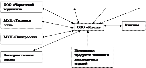 Рис. 2.2 Структура управления ООО «Мечта» Под указанный комплекс услуг было приобретено и установлено оборудование (электроплита, жарочный шкаф, электрический чайник и. т.д.), общей стоимостью свыше 40 тысяч рублей. Внутренние взаимодействия выстроены таким образом, чтобы максимально (при выполнении ограничений о которых было сказано выше) быстро и качественно выполнять заказы клиентов и удовлетворять требованиям контролирующих органов, расплачиваться с монополистами. В качестве примера можно привести информационную цепочку работы с клиентом заказывающим небольшое мероприятия (день рождения, свадьба, юбилейные торжества у какой-либо фирмы и некоторые другие массовые мероприятия, заказ на которые поступает за несколько дней до самого мероприятия). Внешние связи ООО «Мечта» представлены на рисунке 2.3 Монопольные поставщики Контролирующие органы