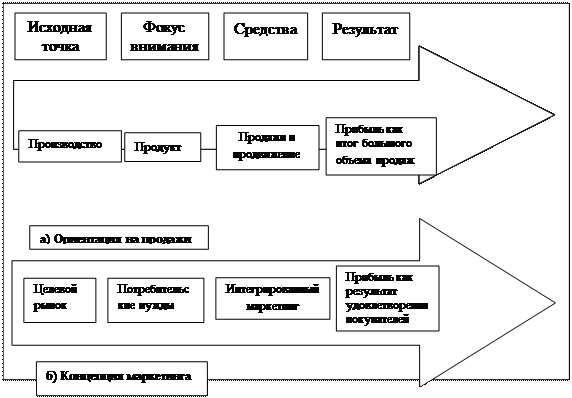 Рис. 1 Различия концепций ориентации на продажи и маркетинга Концепция маркетинга, краеугольным камнем которой является целевой рынок, предполагает, что компании поступают наилучшим образом, когда тщательно определяют целевой рынок (рынки), для которого разрабатывается особая маркетинговая программа. Маркетологи компании «Estee Lauder» в начале 1990-х гг. обратили внимание на быстрый рост покупательной способности некоторых этнических групп населения США. Были разработаны новые серии косметики, специально предназначенные для людей с темной кожей. Осенью 1992 г. Prescriptives, дочерняя компания Estee Lauder, представила новую коллекцию "All skin" («Для всех цветов кожи»), предлагающую 115 различных оттенков основы под макияж. Один из руководителей Prescriptives заявил, что появление новой косметической коллекции привело к увеличению объема продаж компании на 45 %. Нередко компания, определив целевой рынок, не полностью осознает потребности потребителей. Так, ведущая химическая компания разработала новое вещество, которое, затвердевая, превращается в материал, напоминающий мрамор. Маркетинговый отдел предложил использовать новый продукт на рынке сантехники. Компания создала несколько моделей ванн и представила их на выставке с расчетом продемонстрировать производителям сантехники возможности нового материала. Хотя последние нашли новые ванны достаточно привлекательными, ни один из них не решился на организацию производства ванн. Причина была очевидна. Цена одной ванны из синтетического материала достигала $ 2 тыс. За те же деньги можно было купить ванну из настоящего мрамора или оникса. К тому же новые ванны были настолько тяжелы, что их владельцам пришлось бы укреплять полы в доме. Более того, на рынке преобладали ванны по цене $ 500, и очень немногие потребители решились бы расстаться с суммой вчетверо большей. Химическая компания нашла целевой рынок, но ей не удалось понять потребности покупателей. Хотя задача маркетинга – удовлетворение потребностей потребителей и получение прибыли, их идентификация – отнюдь не простая задача. Некоторые потребители не уверены в том, что они нуждаются в каком-то конкретном продукте, не могут четко определить свои требования. Или они используют слова, которые необходимо правильно интерпретировать. Что означает просьба покупателя о «недорогой» машине, «мощной» газонокосилке, «быстром» токарном станке, «привлекательном» купальном костюме или «комфортабельной» гостинице? Рассмотрим, что скрывается за словами потребителя о «недорогом» автомобиле, ведь маркетолог должен уметь «глубоко копать». Мы можем выделить пять типов покупательских потребностей: 1. Заявленные потребности (покупатель хотел бы приобрести недорогую машину). 2. Действительные потребности (покупатель предпочитает недорогую в эксплуатации машину, ее цена не имеет особого значения). 3. Незаявленные потребности (покупатель ожидает хорошего обслуживания со стороны дилера). 4. Приятные потребности (покупатель приобретает машину и в качестве дополнения получает новый атлас автомобильных дорог). 5. Тайные потребности (покупатель стремится выглядеть в глазах друзей ценностно-ориентированным сообразительным потребителем). Удовлетворение только заявленных потребностей потребителя напоминает нам обслуживание покупателей у прилавка. Предположим, 