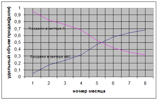 ) как функции двух нечетких параметров: В самом общем случае функция треугольных чисел не есть треугольное число. Однако для большого разнообразия функций, функция принадлежности нечеткого числа A может быть приведена к треугольному виду, а сама нечеткая функция - признана треугольной. Таким образом, мы получаем нечеткую функцию целевого параметра, приведенную к треугольному виду (например, объем продаж). В финансовом плане инвестиционного проекта этот параметр выступает уже как экзогенный, причем, поскольку в бизнес-плане бюджетирование проводится в дискретном времени, то вместо нечеткой функции финансовый план может использовать нечеткую последовательность объемов продаж, например, с поквартальной разбивкой. По аналогии с функциональной маркетинговой моделью мы заметим, что тогда точечные показатели эффективности инвестиционного проекта являются треугольными нечеткими числами. Следовательно, можно решить задачу оценки риска инвестиций в подобный проект [95]. Рассмотрим конкретный проект, связанный с выводом на рынок новой марки минеральной воды «Долинск» ОАО «Каббалкресурсы». Эта задача имеет свой предметный аналог, и ее результат, может быть, применим, например, для оценки эффективности инвестиционного проекта по созданию нового производства. Некоторые моменты, связанные с продвижением минеральной воды «Долинск» на рынок России является коммерческой тайной и поэтому нами были использованы условные обозначения. Рассмотрим ситуацию, сложившуюся с продажей минеральной воды в N-ском районе одной из областей Степной зоны ЮФО России. В силу отдаленности этого района от крупных производителей минеральной воды эта продукция представлена на рынке N-ского района всего двумя секторами: - сектором продаж минеральной воды, производимой на ОАО «Каббалкресурсы» (назовем этот сектор сектором АВС); - сектором продаж минеральной воды, производимой конкурентом - иногородней фирмой "Х" (назовем этот сектор сектором Х). ОАО «Каббалкресурсы» является новым предприятием, только что приступившим к выпуску минеральной воды «Долинск». Однако оно имеет серьезные конкурентные преимущества перед фирмой Х, поскольку не несет глобальных транспортных затрат на ввоз минеральной воды в регион, а также может в ходе рекламной компании акцентировать свою принадлежность к уникальному уголку Северного Кавказа, курортному центру «Долинск», призывая потребителя сделать выбор в пользу воды с целебными свойствами. Такая сильная «патриотическая» имиджевая позиция, вкупе с облегченной структурой затрат, позволяет сделать вывод о том, что новая марка минеральной воды со временем серьезно потеснит продукцию сегмента Х. Остается оценить, какими темпами будет производиться это вытеснение. Зададимся наиболее ожидаемыми значениями экзогенных параметров, то будем решать нашу задачу в рамках четкой модели. Затем, размыв исходные параметры, мы перейдем к нечеткому описанию функции продаж. Обозначим объем продаж в секторе АВС за L(t), млн л. в месяц, где t – номер месяца с момента начала наблюдения за рынком (начало продаж ОАО «Каббалкресурсы»). Также обозначим объем продаж в секторе Х за K(t), млн. литров в месяц. Тогда выполняется равенство L(t) + K(t) = F(t) = Fmax x в (t), (5) где F(t) – суммарный объем продаж минеральной воды, Fmax – предельное ожидаемое значение прода