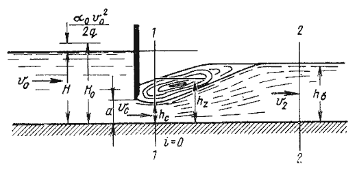 6. Истечение из-под затвора в горизонтальном лоткеВо многих водозаборных и водопропускных гидротехнических сооружениях расходы воды проходят через отверстия, перекрываемые затворами. Затворы поднимают на определенную высоту над дном и пропускают через отверстия необходимые расходы. Чаще всего на гидромелиоративных сооружениях устраивают отверстия прямоугольного сечения, истечение из которых и рассмотрим. Отверстия могут быть незатопленными (истечение свободное) и затопленными, когда уровень воды за затвором влияет на истечение. Если отверстие незатопленное, то вытекающая из-под затвора струя находится под атмосферным давлением (рис.13). При истечении через затопленное отверстие струя за затвором находится под некоторым слоем воды (рис.14).