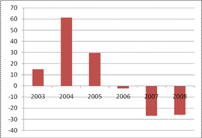 Положительные значения показателей в 2003-2006 годах говорят об увеличении объема продукции. Но в 2007 году происходит падение объемов продукции - уменьшается на 3% по сравнению с 2006 годом. Далее происходит последующее снижение на 27 и 26%. График 2. Динамика прироста объема инновационной продукции РК. (млн.тг.)
