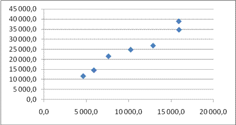 Тенденция роста показателя четко проглядывается на график. Но выровненные значения не сильно отличаются от основных. Корреляционно-регресионный анализ Используя инструменты корреляционно-регресионного анализа, я хотела бы провести анализ зависимости доли внутренних затрат на исследования и разработки от ВВП за 2003-2009 года. Выдвинем предположение о существовании зависимости результирующего показателя доля внутренних затрат на исследования (введём для него обозначение у) и исходного показателя ВВП, обозначив последний х. График 5. Поле корреляции показателей.